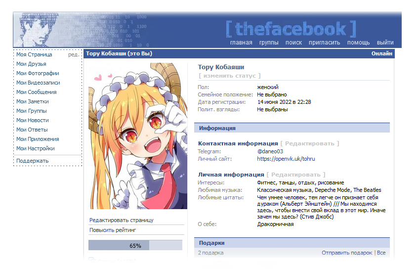 - Совет: Чтобы ваш профиль выглядел красиво и презентабельно, вы можете его заполнить какой-либо информацией или загрузить фотографию, которая подчеркнёт, например, ваш глубокий внутренний мир.