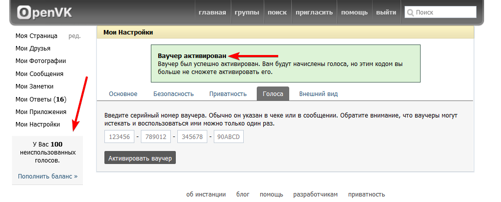 Успешная активация (например, нам зачислили 100 голосов)